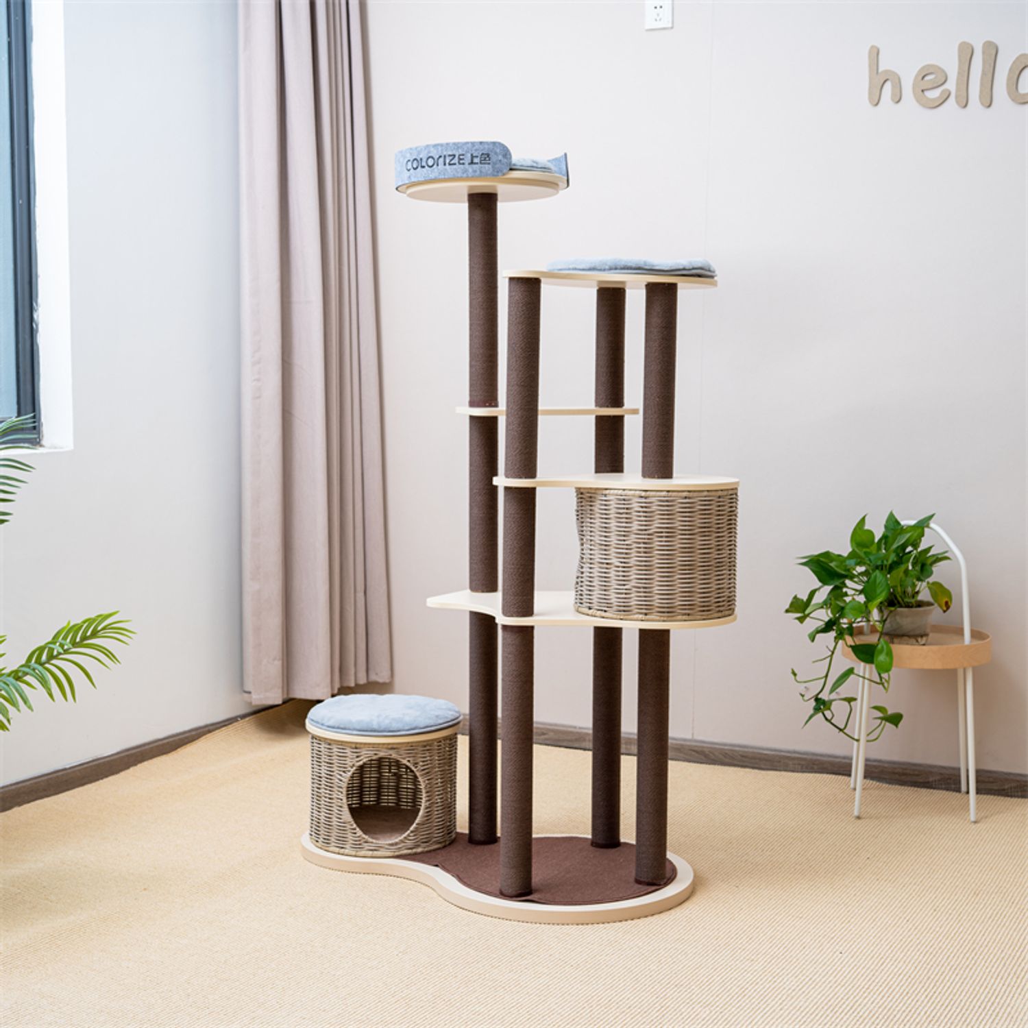 Rattan cat house: The cat furniture includes a rattan cat house where your feline companion can retreat and relax. The rattan material is not only durable but also adds an element of style to the overall design.